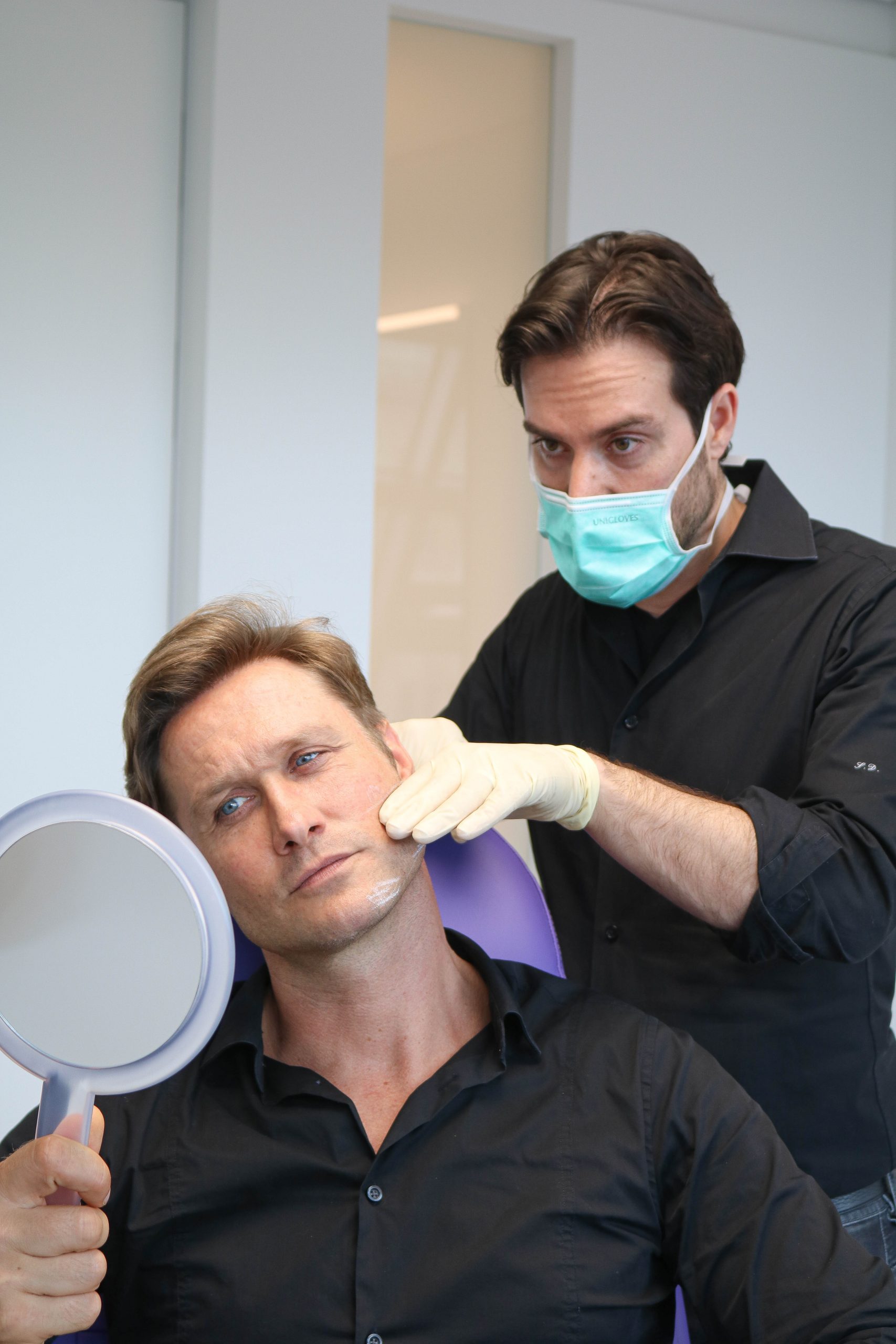 Nico Schwanz (li.) und Dr. Sina Dajlaei besprechen die Behandlung nach dem „Mascu-Look“-Konzept (alle Foto: Juvéderm®)
