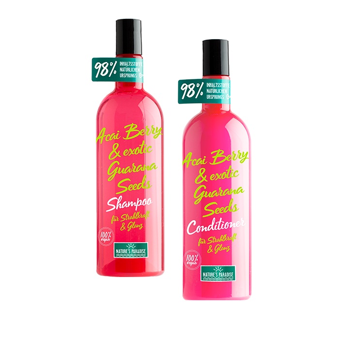 - Aloha, Beauty! Das „Nature’s Paradise Acai Berry & Exotic Guarana Seeds Shampoo“ und der „Nature’s Paradise Acai Berry& Exotic Guarana Seeds Conditioner“ zaubern strahlende Haare wie frisch aus dem Urlaub. Die aus dem Amazonasbecken stammenden Acai-Beeren – zell-stimulierende Vitamin A- und C-Kraftpakete sowie reich an mehrfach ungesättigten Omega 3 + 6 Fettsäuren – sind ein Power-Booster für Kopfhaut und Haare. Exotische Guarana-Samen, die Protein-Wunder, stärken die Haarstruktur und sorgen sofort sichtbar für Geschmeidigkeit und glänzende Haare mit wunderbarer Elastizität. Das Ergebnis: Exotic-Power – fühlbar mehr elastische Geschmeidigkeit und sichtbar mehr Strahlkraft und Glanz!