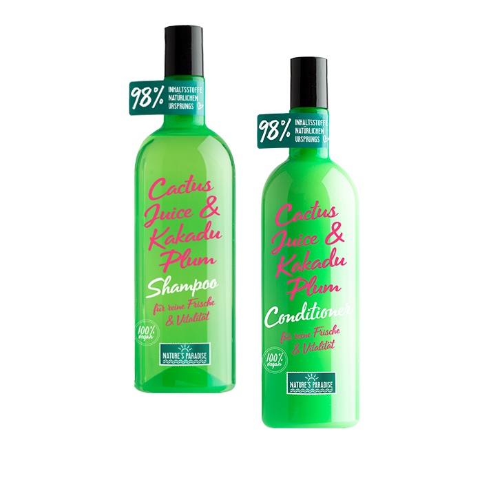 - Viva la paraíso! Das „Nature’s Paradise Cactus Juice & Kakadu Plum Shampoo“ und der „Nature’s Paradise Cactus Juice & Kakadu Plum Conditioner“ betören mit ihrem belebendem Duft und der unverfälschten Kraft der Natur: Die Kakdu Plum, auch als australische Buschpflaume bezeichnet, stärkt das Haar durch ihren unvergleichlich hohen Vitamin C Anteil (50 x mehr Vitamin C als die Orange) und Kaktus-Feigen-Saft sorgt für fett-regulierende Antioxidantien Power. Zusammen beleben Shampoo und Conditioner müdes und mattes Haar und sorgen für ein frisches, gesundes, und kraftvoll-widerstandsfähiges Haarfeeling – von der Wurzel bis zu den Spitzen. Das Ergebnis: Tiefengereinigtes Haar – energetische Frische und kraftvolle Vitalität.