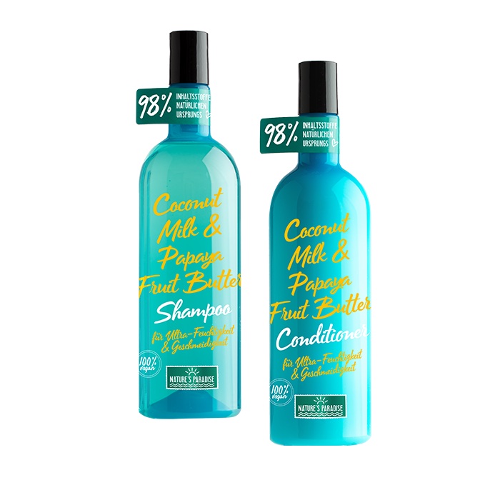 - Worry less. Beach more! Das „Nature’s Paradise Coconut Water & Papaya Fruit Butter Shampoo“ und der „Nature’s Paradise Coconut Water & Papaya Fruit Butter Conditioner“ verführen mit einem köstlich cremigen Duft & äußerst wirksamen Substanzen. Eine perfekt-tropische Powerformel mit exotischen Superfruits und Superfoods. Das zart-duftende Kokoswasser ist leicht kühlend, gibt Feuchtigkeit und Geschmeidigkeit und wirkt rückfettend und glättend. Die Papaya Frucht ist reich an Vitaminen A & C und enthält das wertvolle Enzym „Papaine“. Das Ergebnis: Ein sorglos glückliches Haargefühl – sichtbare Geschmeidigkeit & perfekt genährte Haare.