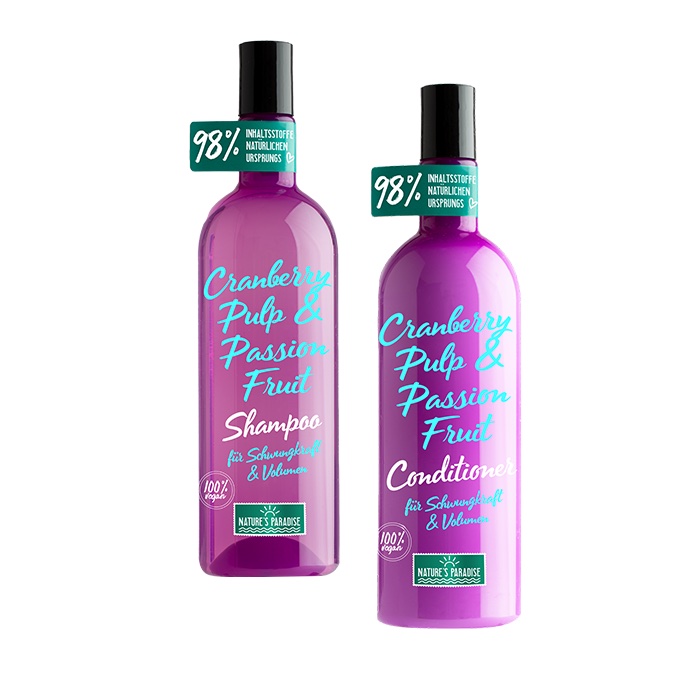 - Beach please! Das „Nature’s Paradise Cranberry Pulp & Passion Fruit Shampoo” und der „Nature’s Paradise Cranberry Pulp & Passion Fruit Conditioner“ sind superduftendes Superfood für Super-Volumen-Haare: Cranberry-Fruchtfleisch-Power stärkt dank kraftvoller Antioxidantien die Haarstruktur und begünstigt das Zellwachstum. Die exotische Passionsfrucht enthält wertvolle Anti-Aging Wirkstoffe, ungesättigte Fettsäuren und viele Vitamine. Zusammen unterstützen Shampoo und Conditioner dünnes, kraftloses oder gestresstes Haar. Das Ergebnis: Spürbare Haar-Verdichtung, sichtbares Volumen, mehr Schwung und ein paradiesisches #holidayhair Feeling.